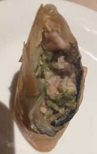 「鶏肉とキクラゲとムール貝とフキノトウの春巻」